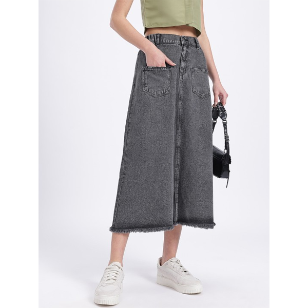 Denim Power Light Fade Pure Cotton Midi A-Line Skirt with Frayed Hem