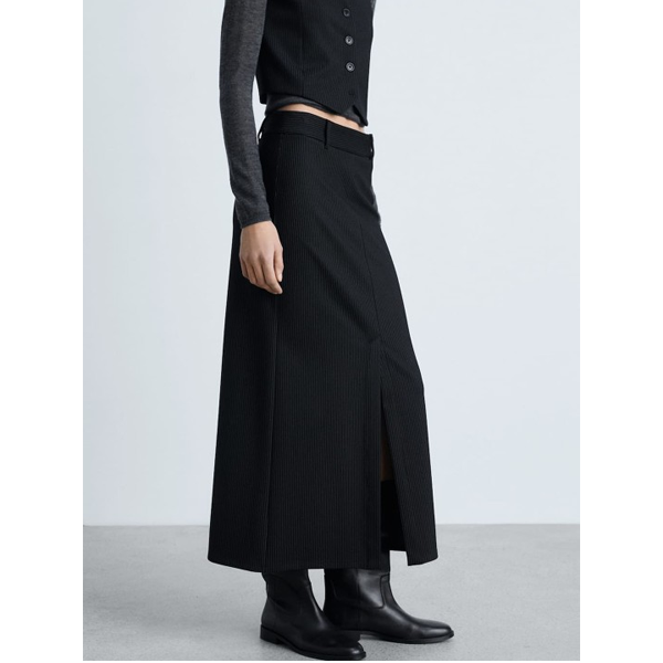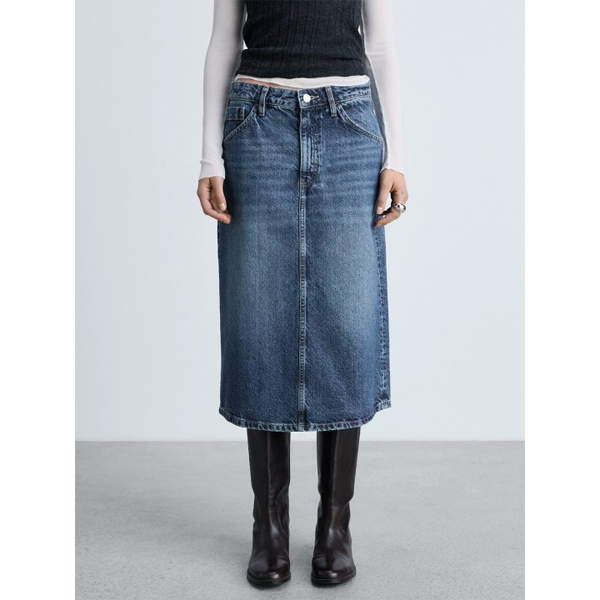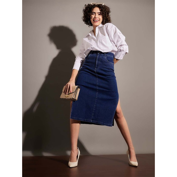Navy Blue Denim Side Slit Pencil Midi Skirt