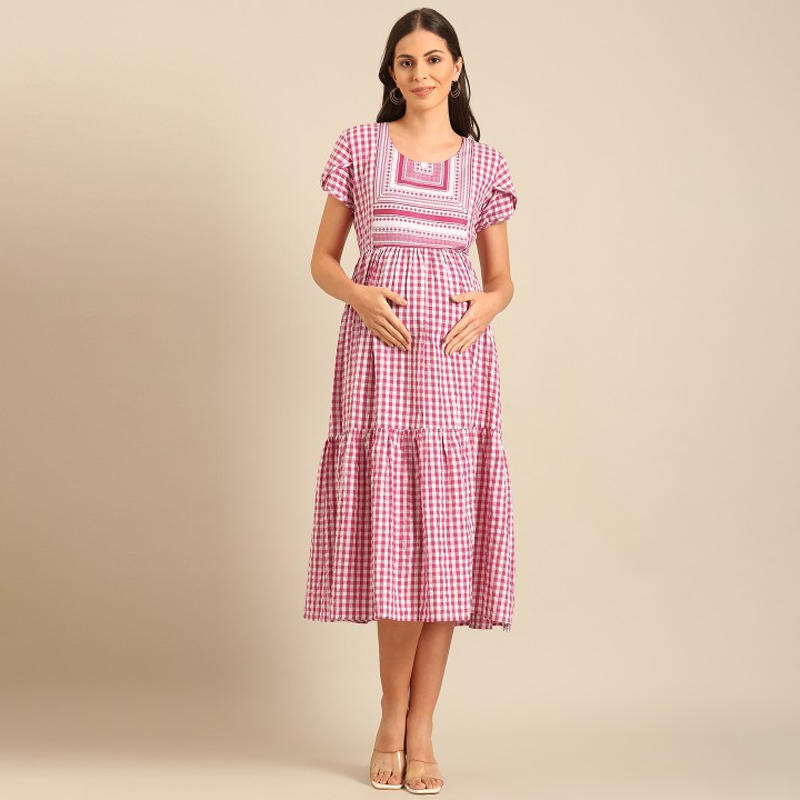 Checked Puff Sleeves Maternity Fit & Flare Dress