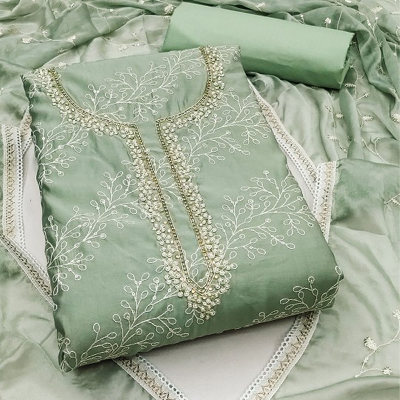 Embroidered Unstitched Kurta & Trouser With Dupatta Dress Material