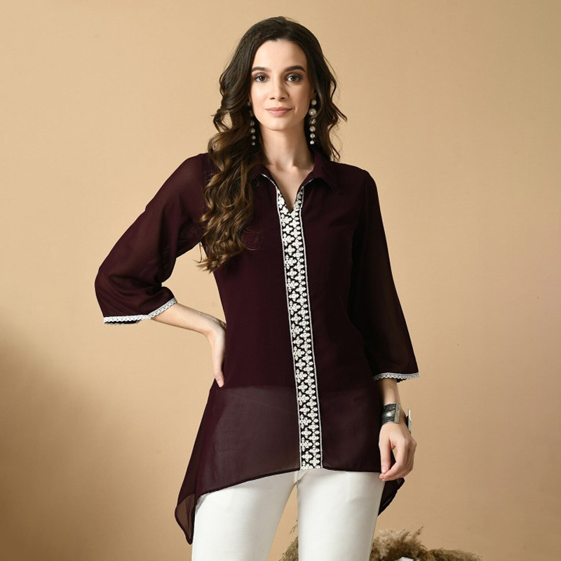 Embroidered Shirt Collar Georgette Tunic